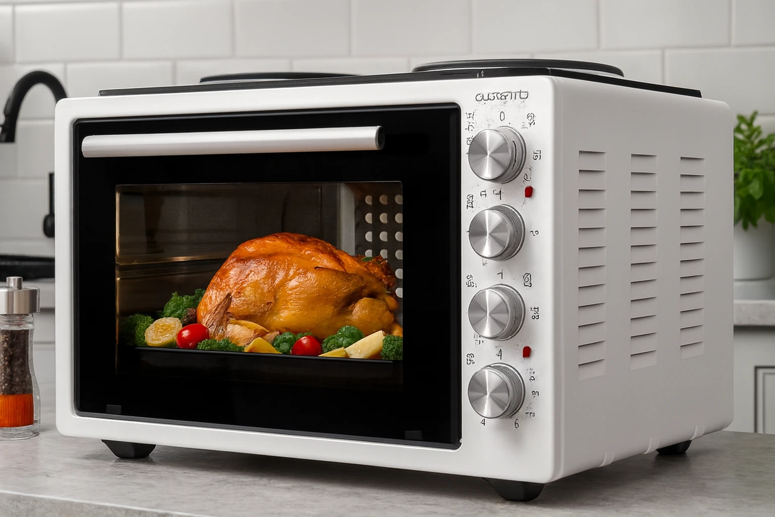 - Upper (650W) and lower (650W) heating elements