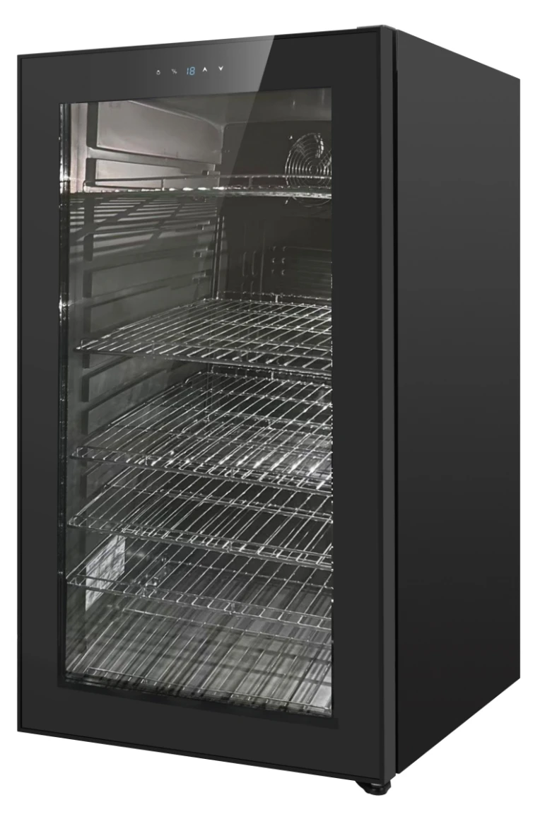 Freestanding modern refrigerated display cabinet with a capacity of 130 l and 6 wire shelves.