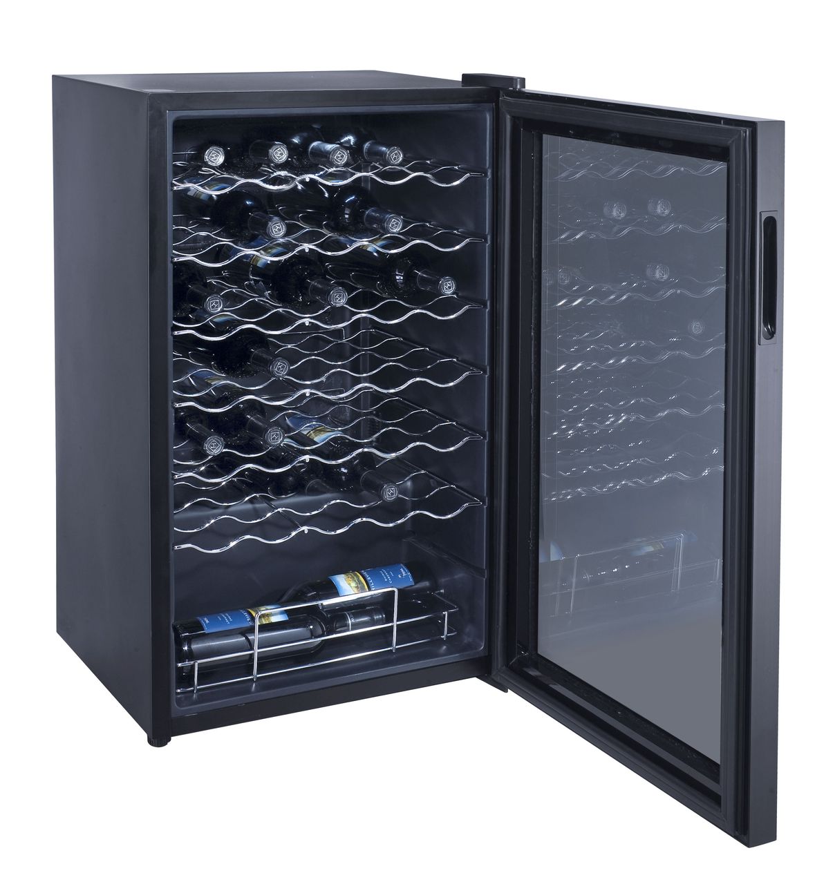 - door made of tempered and hardened two ply glass protecting wine from sunlight and light